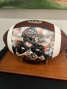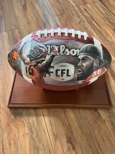 As a Canadian artist who has experience painting CFL players and partnering with the BC Lions, it felt like a natural next step. So I began creating custom CFL footballs—hand-painted, one-of-one pieces meant to celebrate milestones, retirement seasons, community awards, and major moments in a player’s career