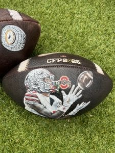 My first step into the world of painted footballs happened when I approached Gridiron Football Prep in New Jersey and that led to an opportunity to create a set of custom Ohio State Buckeyes–themed footballs. Painting detailed artwork on leather presented a whole new artistic challenge, but the results opened my eyes to what could be done. Each ball became more than a piece of equipment—it became a storytelling surface, a way to honor pride, legacy, and achievement.